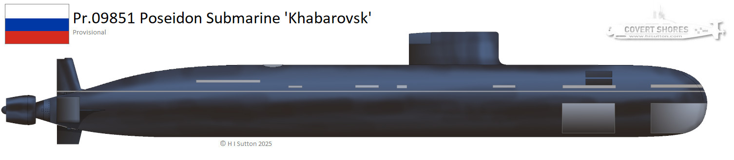 Khabarovsk likely shares the propulsion module with the Borei-A class SSBNs. A minor detail is that the towed array sonar is only present on the port (left) side.