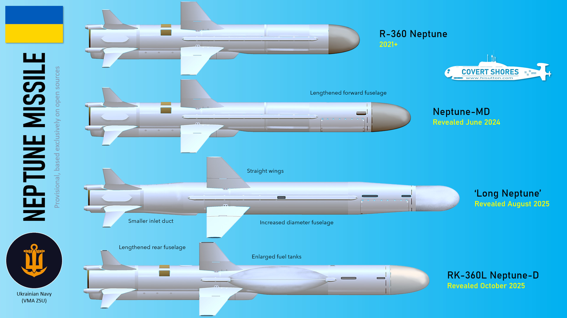 The latest variant to be revealed, the RK-360L Neptune-D, features a significantly longer fuselage than the baseline R-360 Neptune model, with conspicuous enlarged fuel tanks ahead of the main wing. These saddle tanks appear to almost double the fuel load, assuming no reduction in warhead size.